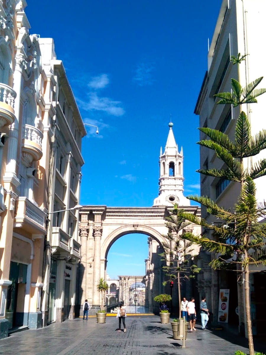 El reflejo deslumbrante del sol de altura sobre la pulida piedra blanca del sillar de la catedral, con el azul intenso del cielo como telón de fondo, parece el corazón del casco antiguo de una ciudad peruana, donde alojarse en Arequipa te conecta fácilmente con el centro de la ciudad.