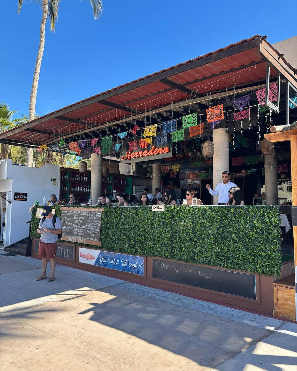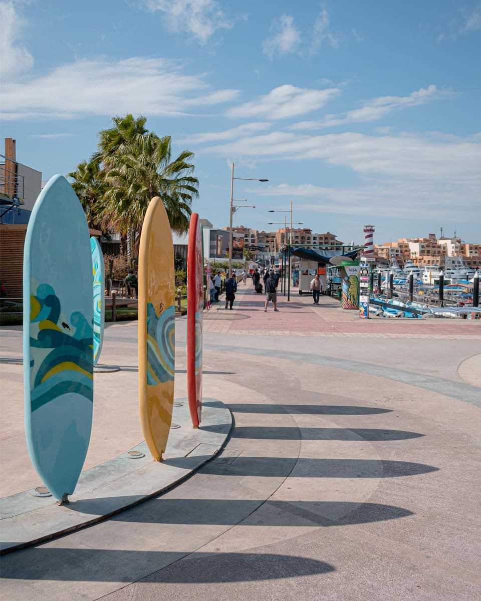 Paseo marítimo del puerto deportivo. El puerto deportivo de Cabo San Lucas es el corazón náutico de la región, con más de 380 amarres. El paseo marítimo del puerto deportivo se extiende a lo largo de 1,2 kilómetros, repleto de restaurantes, bares y operadores turísticos. Latitude 22+ (de 11:00 a 2:00) ofrece cenas con vistas al puerto y su famoso plato «Drunken Shrimp» (camarones borrachos). Los artistas callejeros entretienen al público todas las noches de 7 a 10 de la noche, con bandas de mariachis que tocan música tradicional mexicana.